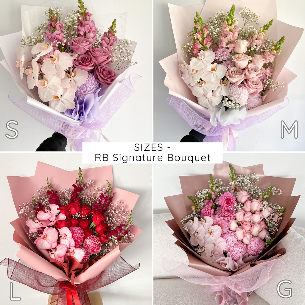 The most popular bouquet, remade in different colour variations! RB's lux signature bouquet includes beautifully hand reflexed roses and all the other favourites. Choose from our colour palette - or leave it to us.