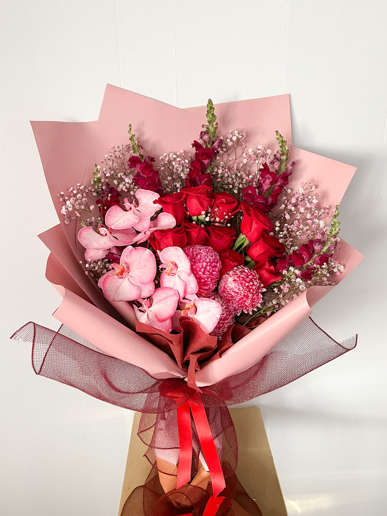 Our most popular bouquet with a mix of all the favourites - Columbian roses, baby's breath, mums, phalaenopsis orchid and more!