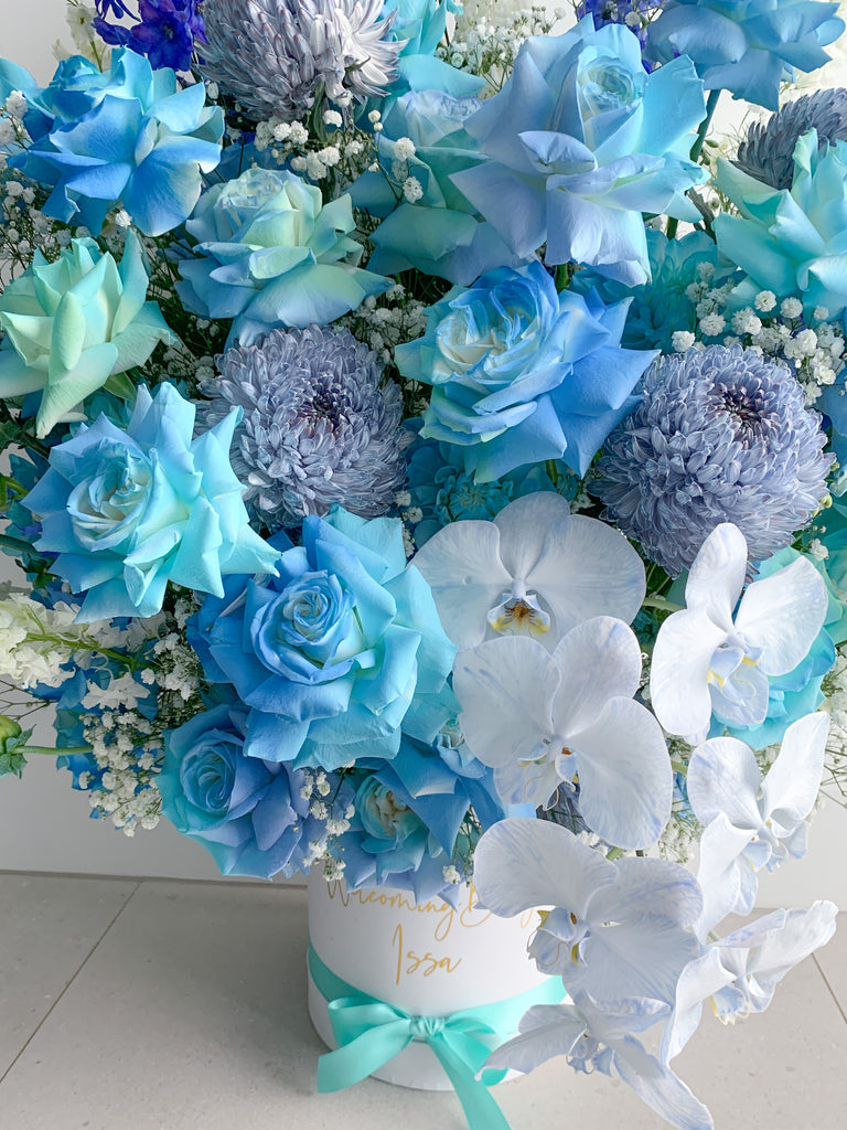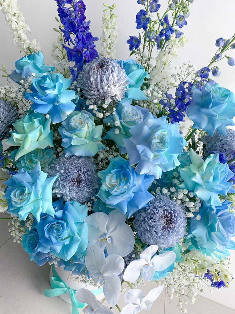 A super grand arrangement filled with hand sprayed blue & teal roses paired with other gorgeous flowers to pretty much bring the ocean to her.