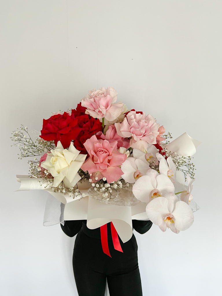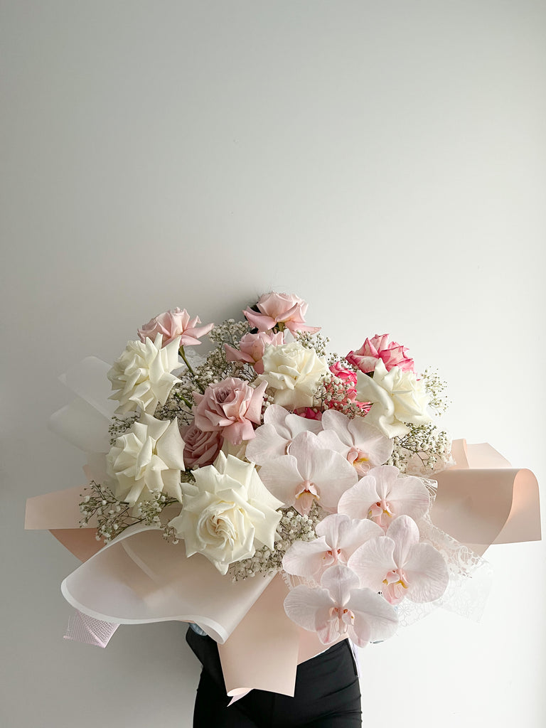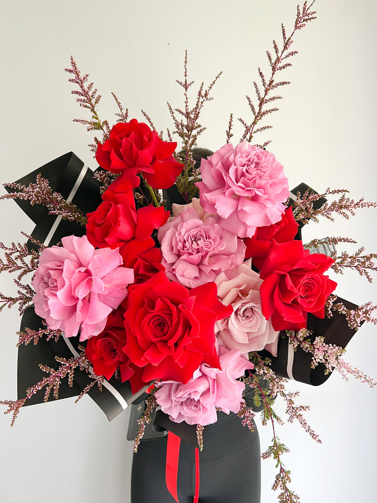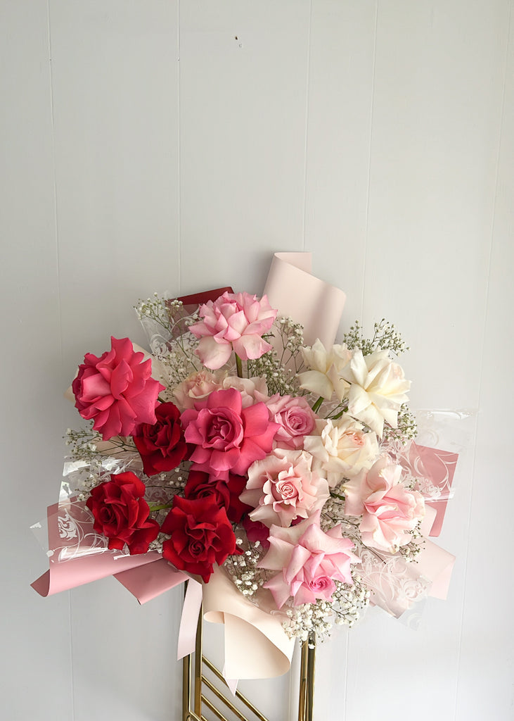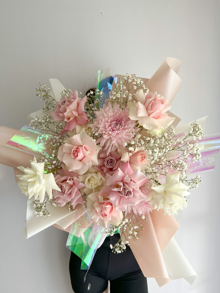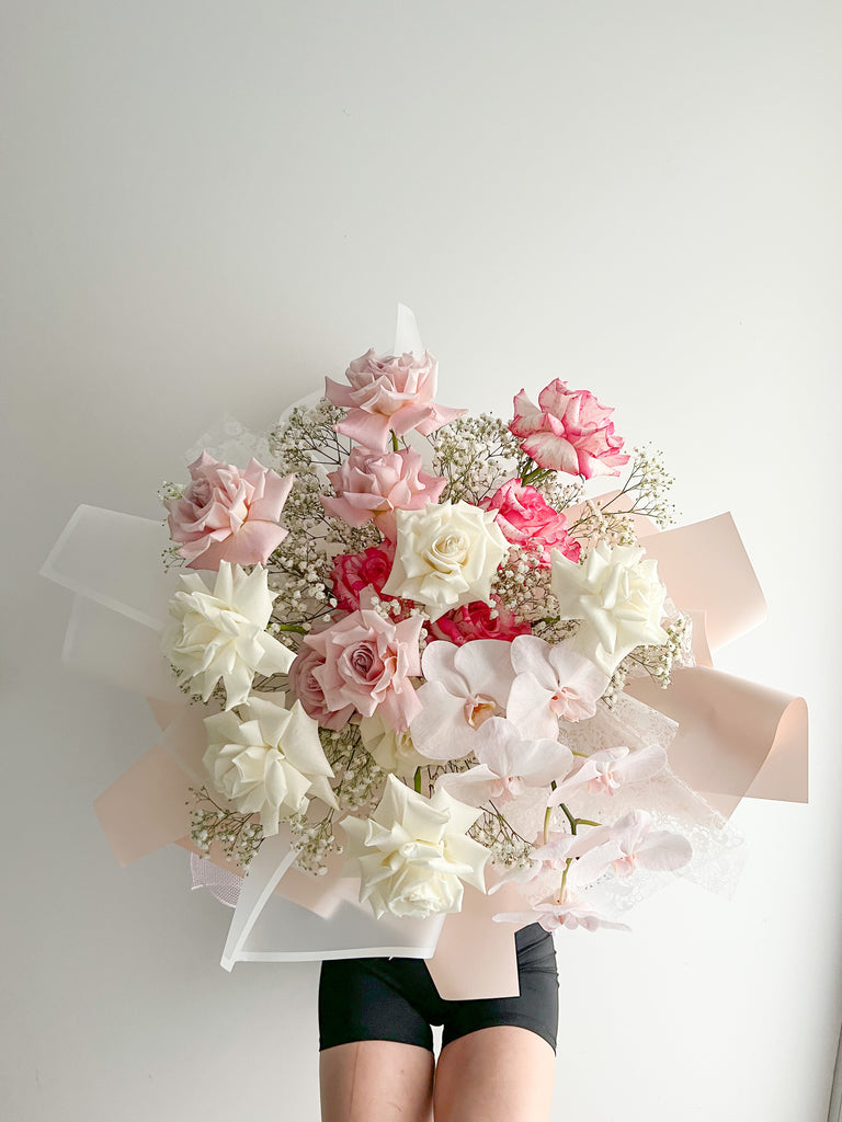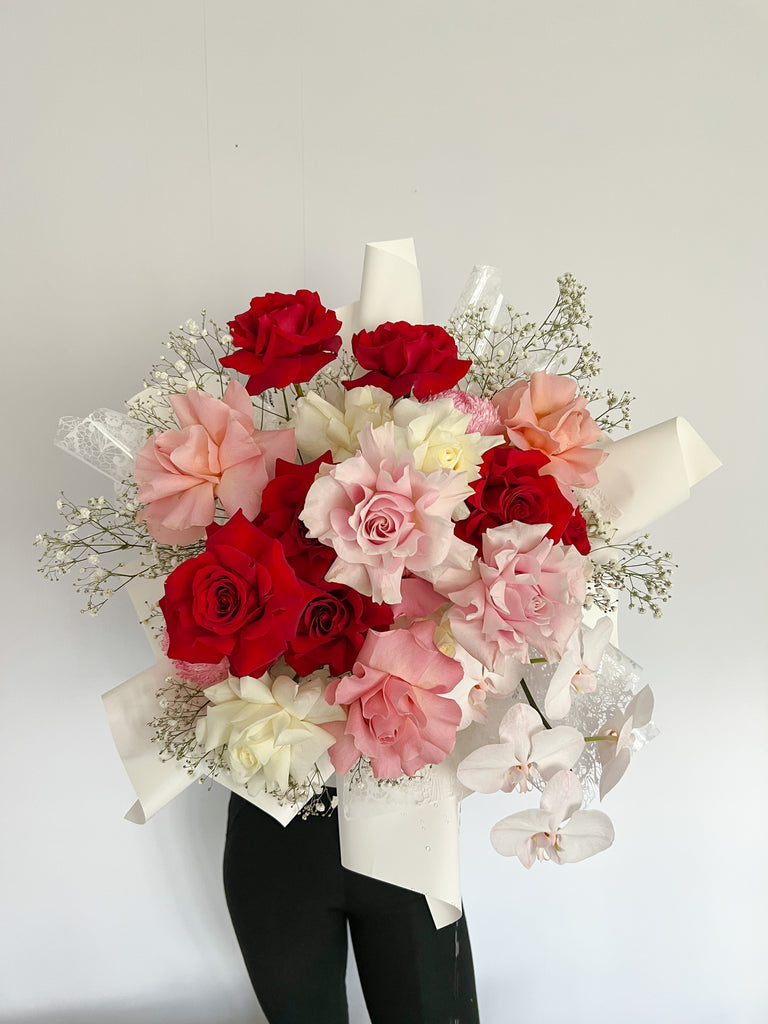 Our Bespoke Bloom Box Bouquet (B4) is an incredible arrangement made mainly with reflexed Columbian Roses mixed with baby's breath and other beauties.