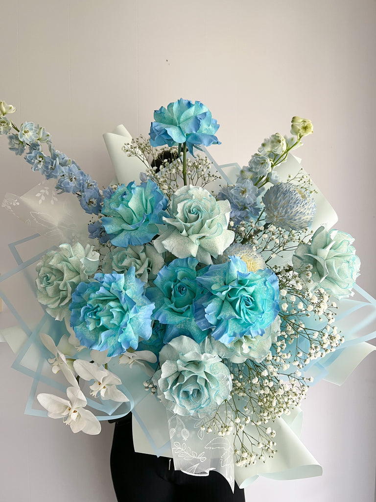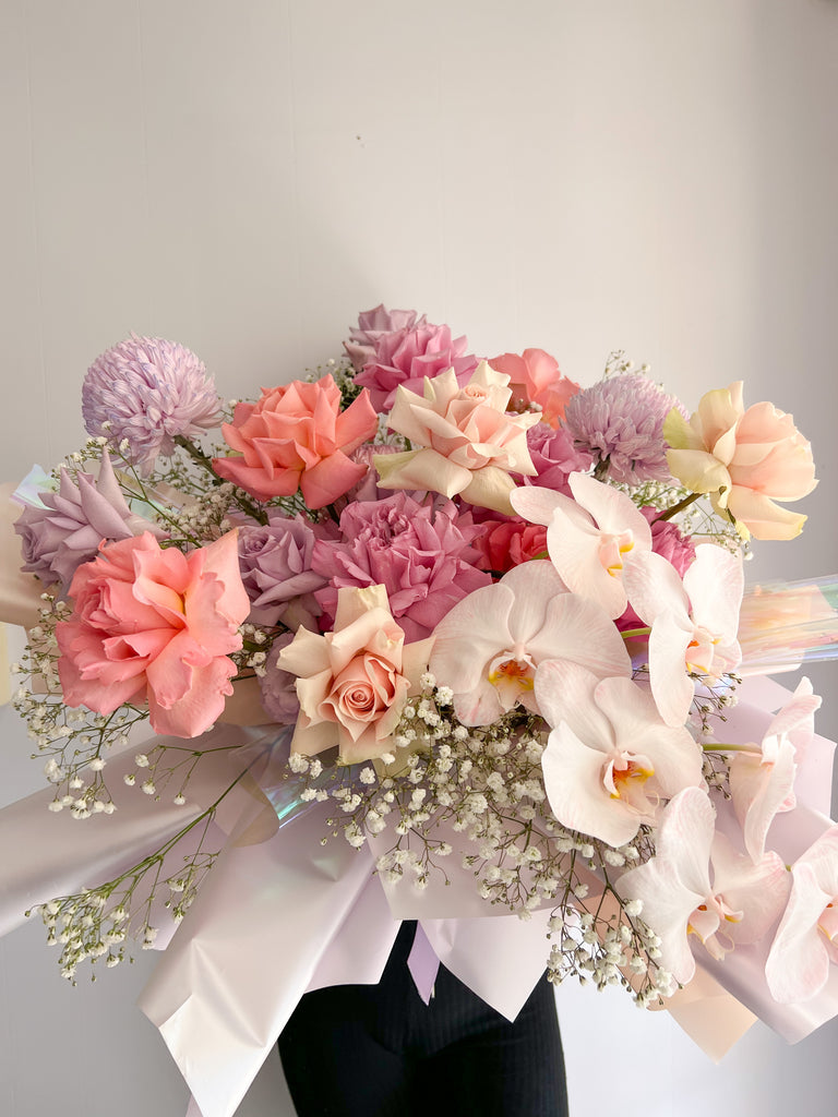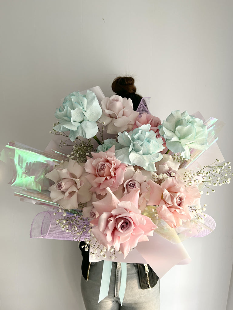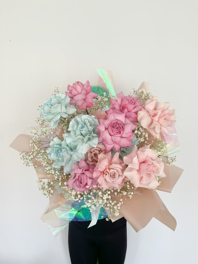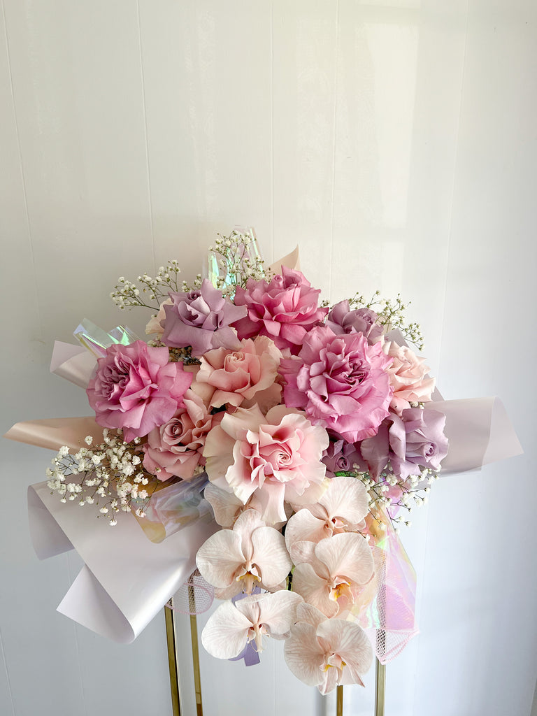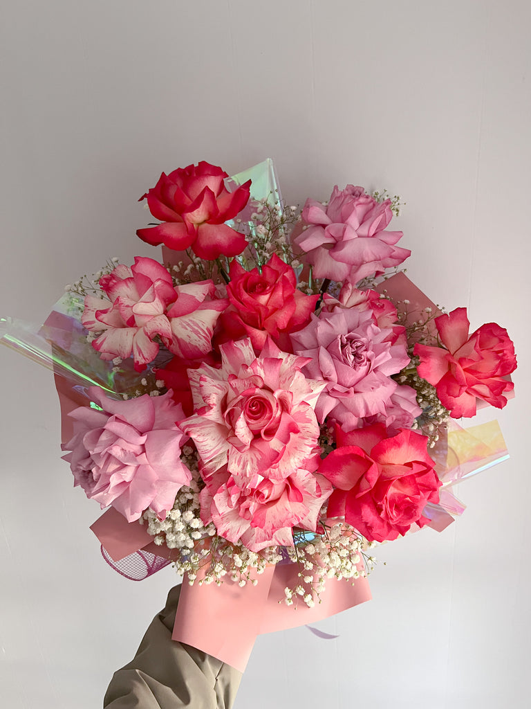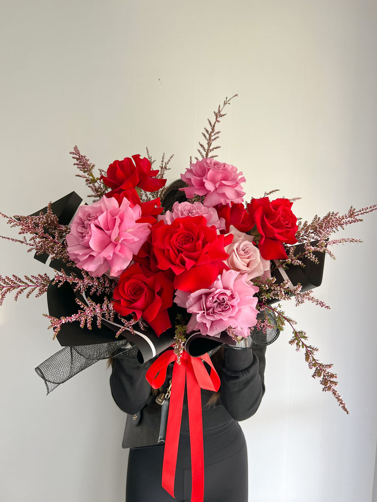 Our Bespoke Bloom Box Bouquet (B4) is an incredible arrangement made mainly with reflexed Columbian Roses mixed with baby's breath and other beauties.