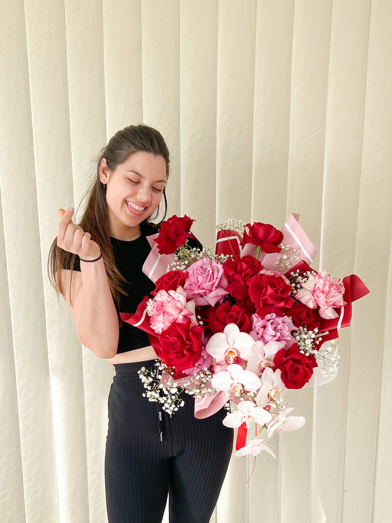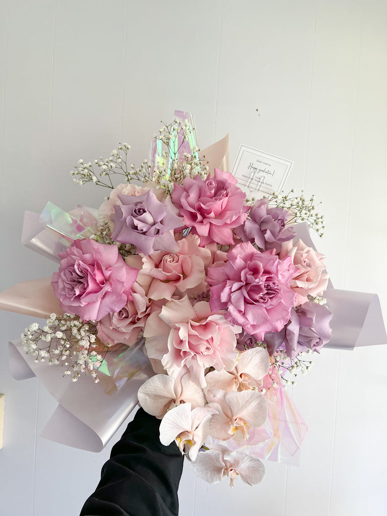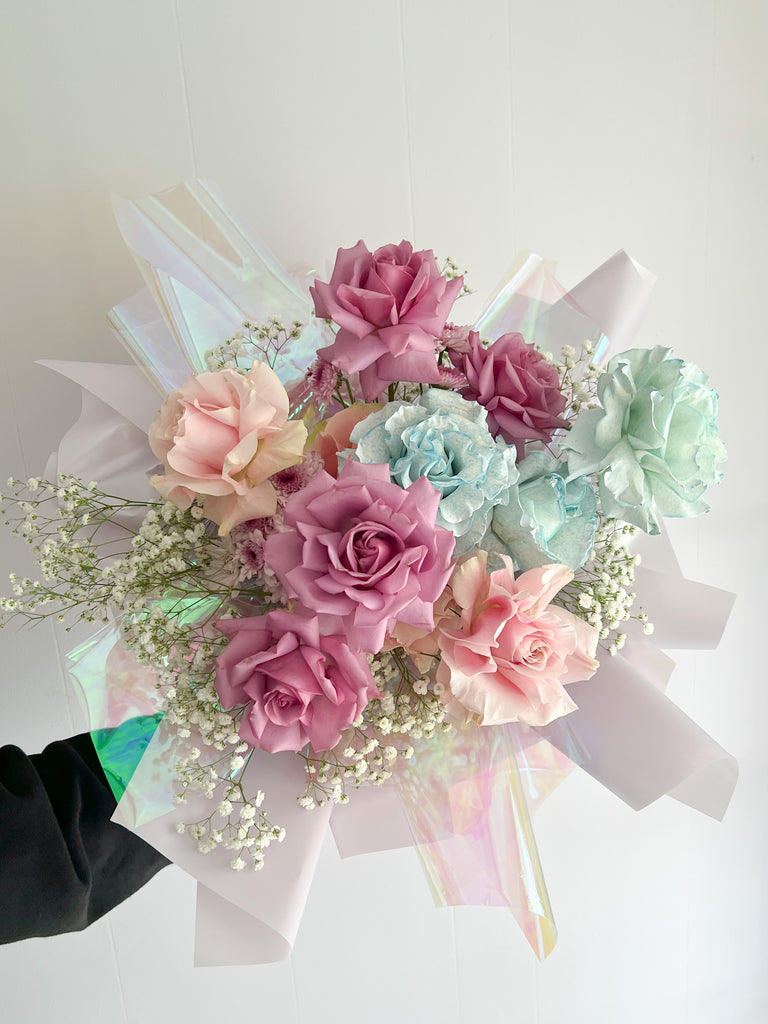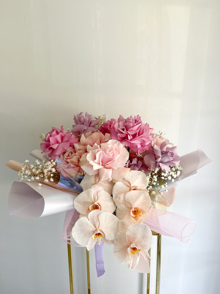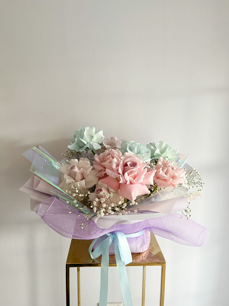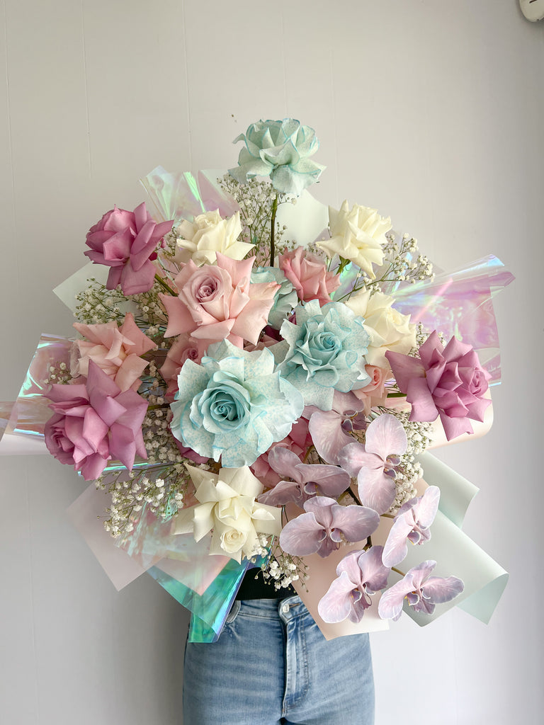 Our Bespoke Bloom Box Bouquet (B4) is an incredible arrangement made mainly with reflexed Columbian Roses mixed with baby's breath and other beauties.