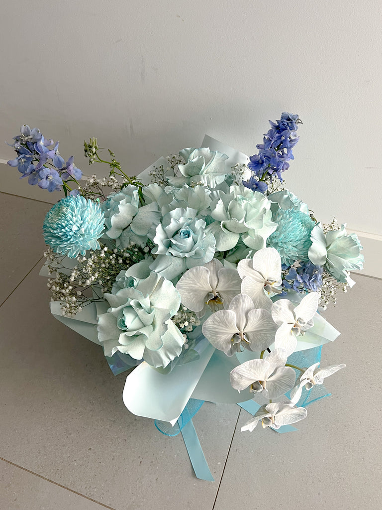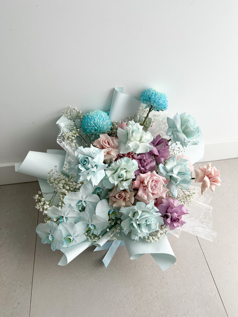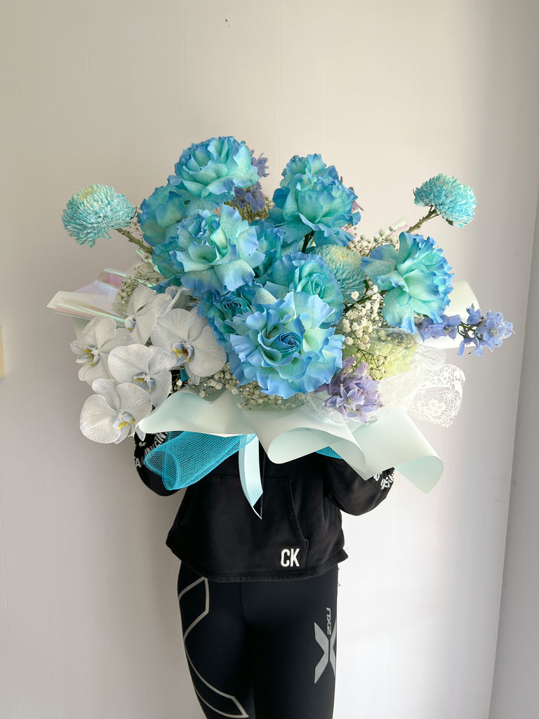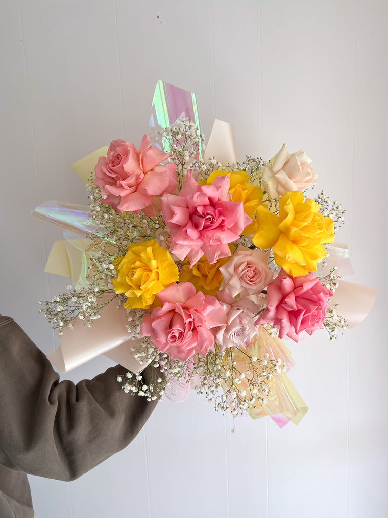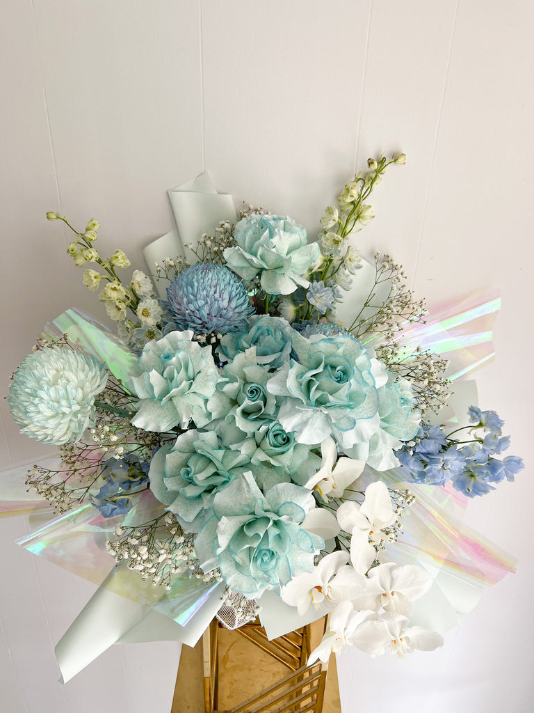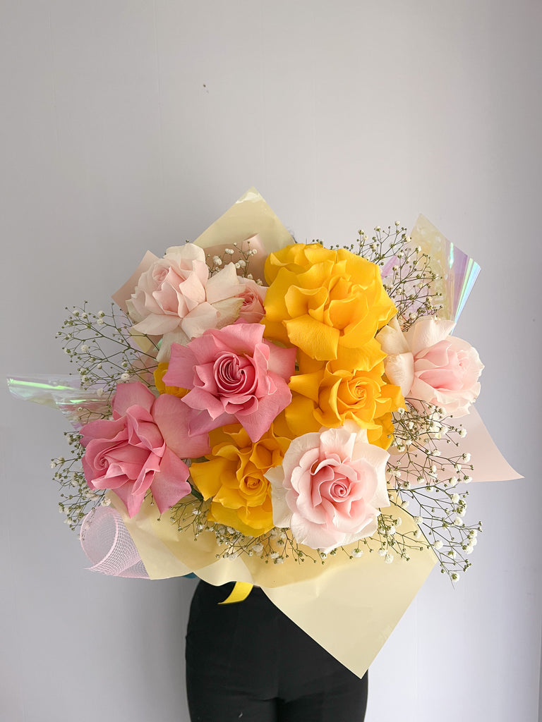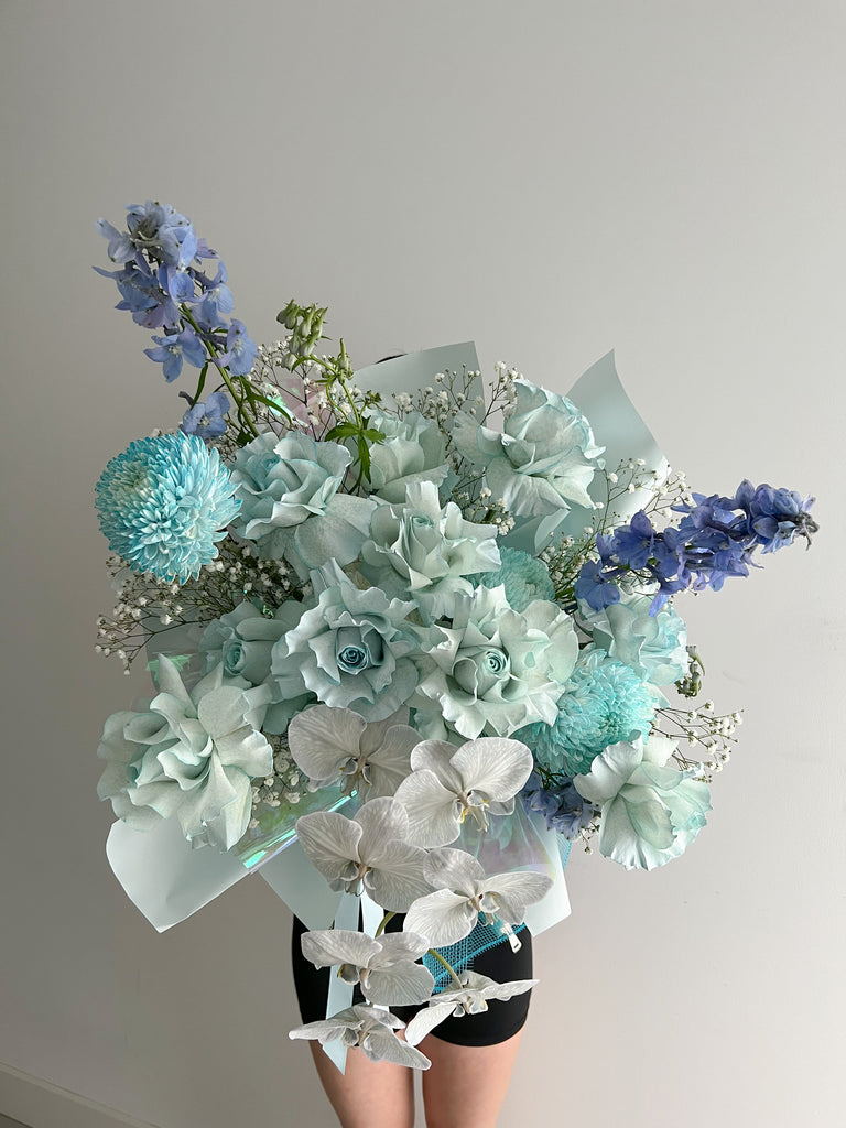 Our Bespoke Bloom Box Bouquet (B4) is an incredible arrangement made mainly with reflexed Columbian Roses mixed with baby's breath and other beauties.
