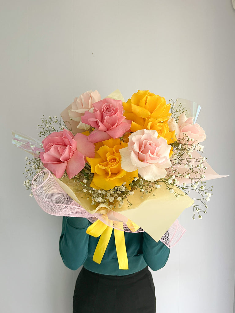 Standard arrangements mainly consist of roses, baby's breath and some other flowers