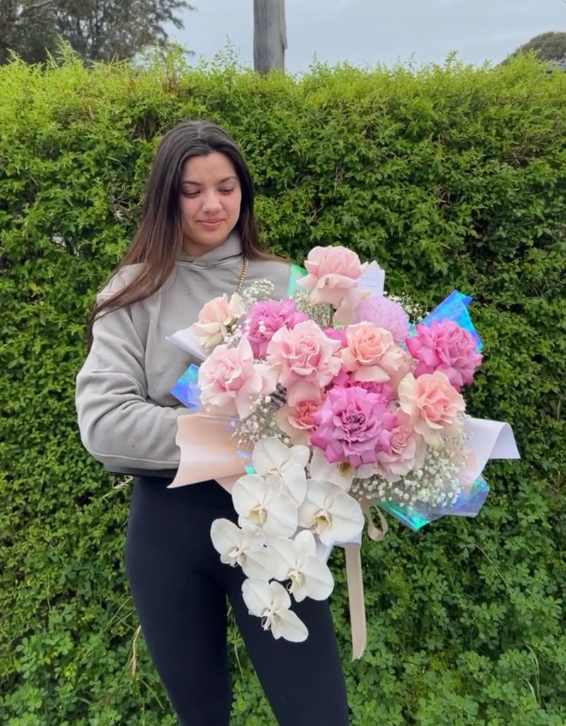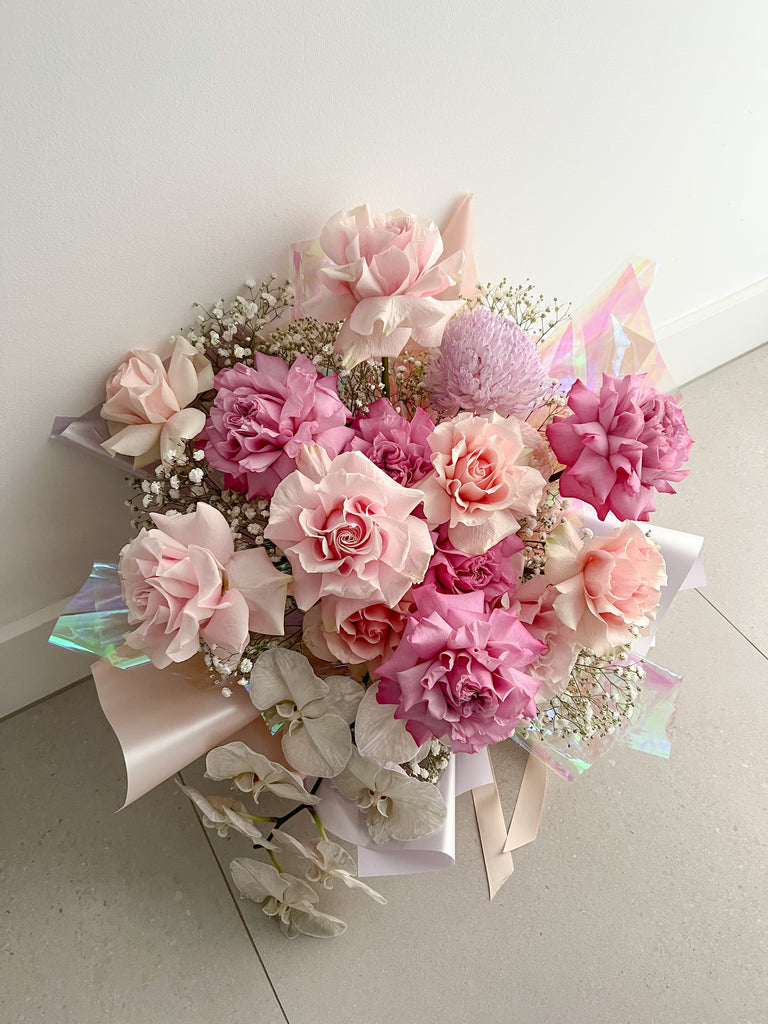 Our Bespoke Bloom Box Bouquet (B4) is an incredible arrangement made mainly with reflexed Columbian Roses mixed with baby's breath and other beauties.