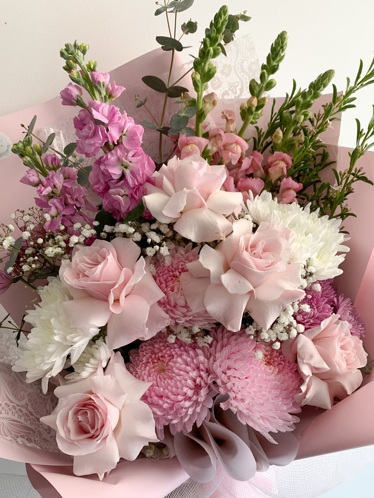A popular mix of pastel pinks with touches of white.